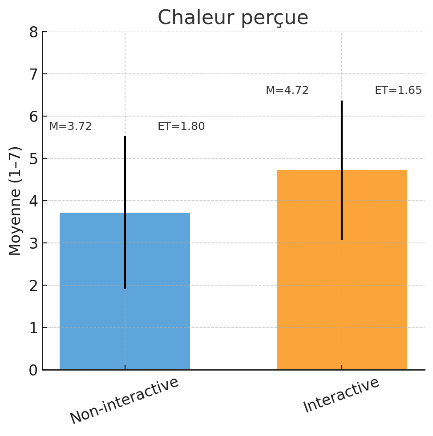 Moyennes (M) et écarts-types (ET) pour la chaleur perçue, la compétence perçue et la satisfaction globale selon l’aménagement de la salle d’attente (salle interactive vs. non interactive).